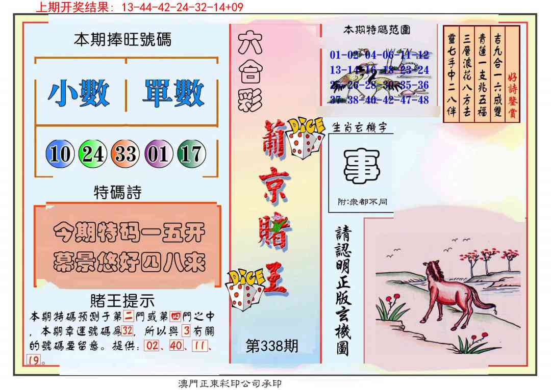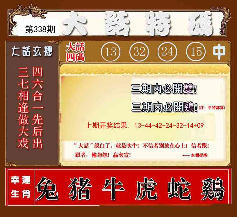 | 337期⑥肖 | 马蛇虎猪狗鸡 | 开:鸡09准 |
